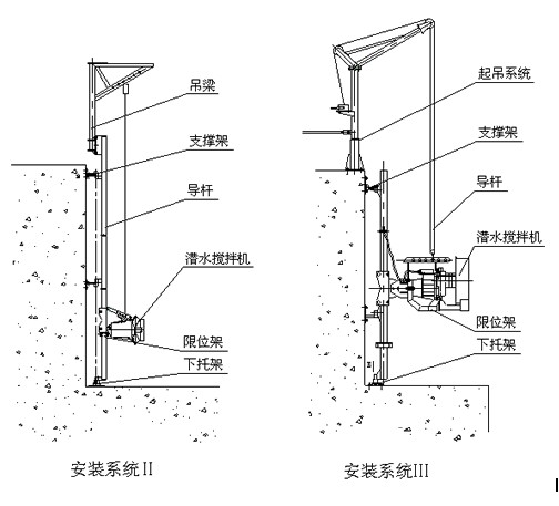 當池深H<4米時建議采用安裝系統一。潛水攪拌機的潛水深度可以根據需要進行垂直方向的調節,而且在水平賣弄內可繞導桿旋轉的角度為正負60°起吊系統底座、支撐架和下托架與池的有關連接面均采用膨脹螺栓固定,無需預留孔。安裝系統二用導向鋼繩替代導桿,具有運輸方便,現場安裝簡單等特點。該系統從根本避免了由于運輸引起導桿彎曲的、變形從而影響正常使用的情況,并有效改善了池深過深情況下,由于導桿的安裝誤差而導致的無法正常起吊等現象。在有懸臂池頂的安裝條件下更顯得操作方便可靠。